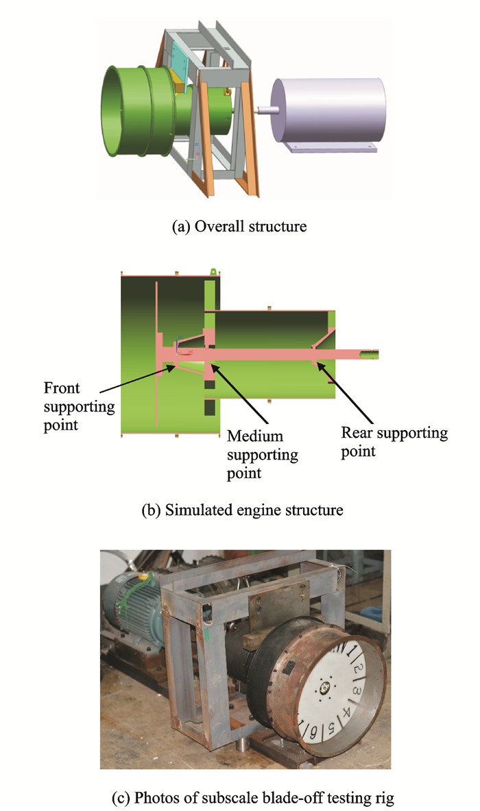 Li et al. of Beijing University of Aeronautics and Astronautics presented systematic experimental research results for transient response of rotor system with elastic damping support after blade-off[61]. They conducted tests at different rotor speed, with different film clearances of squeeze film damper (SFD), and by applying different sudden imbalance. Hong et al.conducted respective research on rotor system dynamics under large imbalance load[62]. Aimed at the aero-engine dynamic response to blade-off load, they analyzed the physical process and mechanical behavior of engine structures including casing, rotor-bearing system and engine mount. The experimental analysis model for rotor system dynamics was established based on the structural and mechanical characteristics of turbofan engine with large bypass ratio, and numerical simulation was carried out. Yet experimental simulation research on engine FBO has not been published. Wu[63] from Nanjing University of Aeronautics and Astronautics established a scaled engine rotation simulation test rig for blade-off, as shown in Fig. 5. During blade-off tests, they set sensors or transducers at key positions to pick up displacement, force and acceleration so as to measure the axis orbit, load of main bearing structures, vibration of and force on bearing seat, as well as engine vibration.