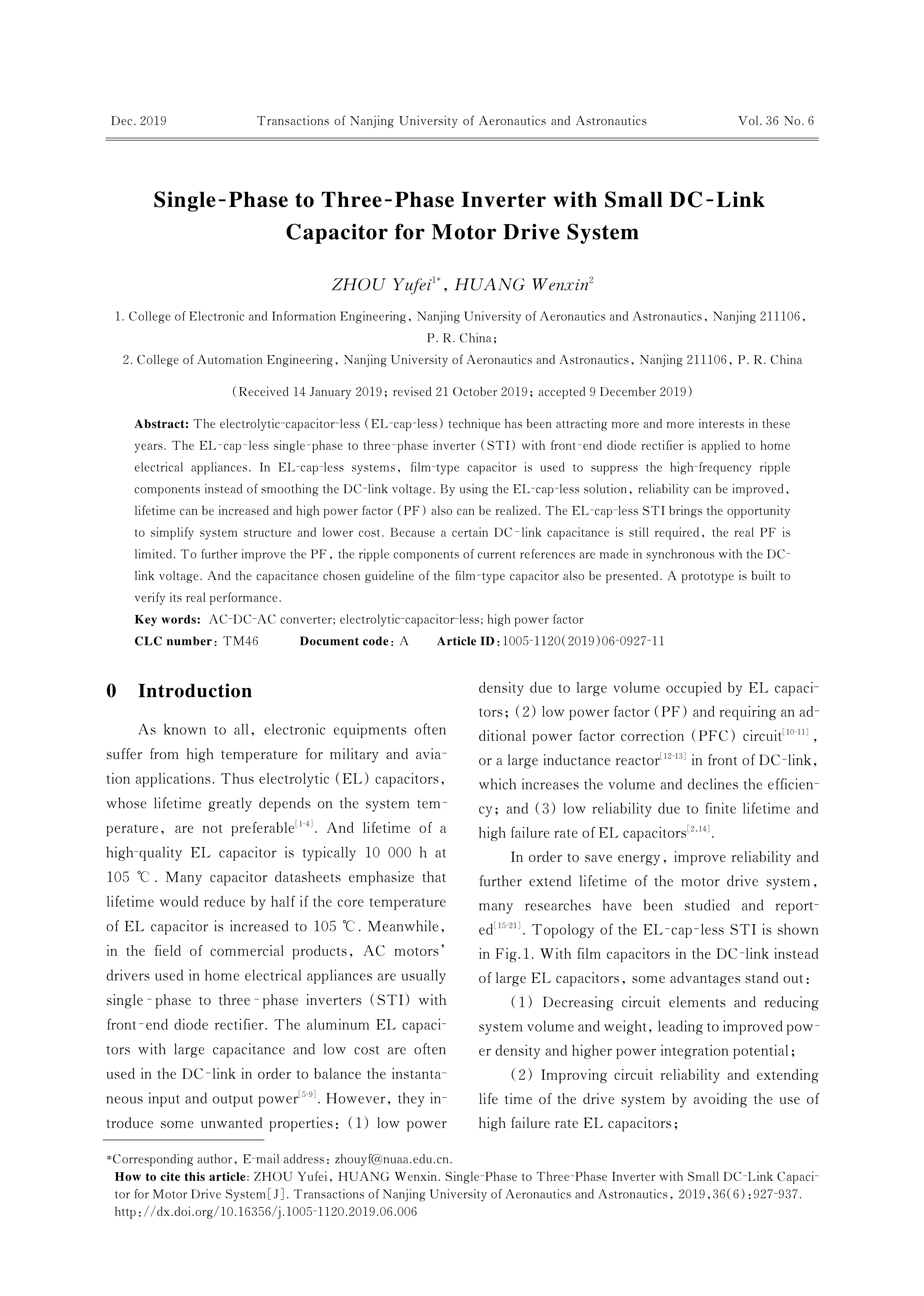 ZHOU Yufei, HUANG Wenxin. Single-Phase to Three-Phase Inverter with Small DC-Link Capacitor for Motor Drive System[J]. Transactions of Nanjing University of Aeronautics & Astronautics,2019,36(6):927-937