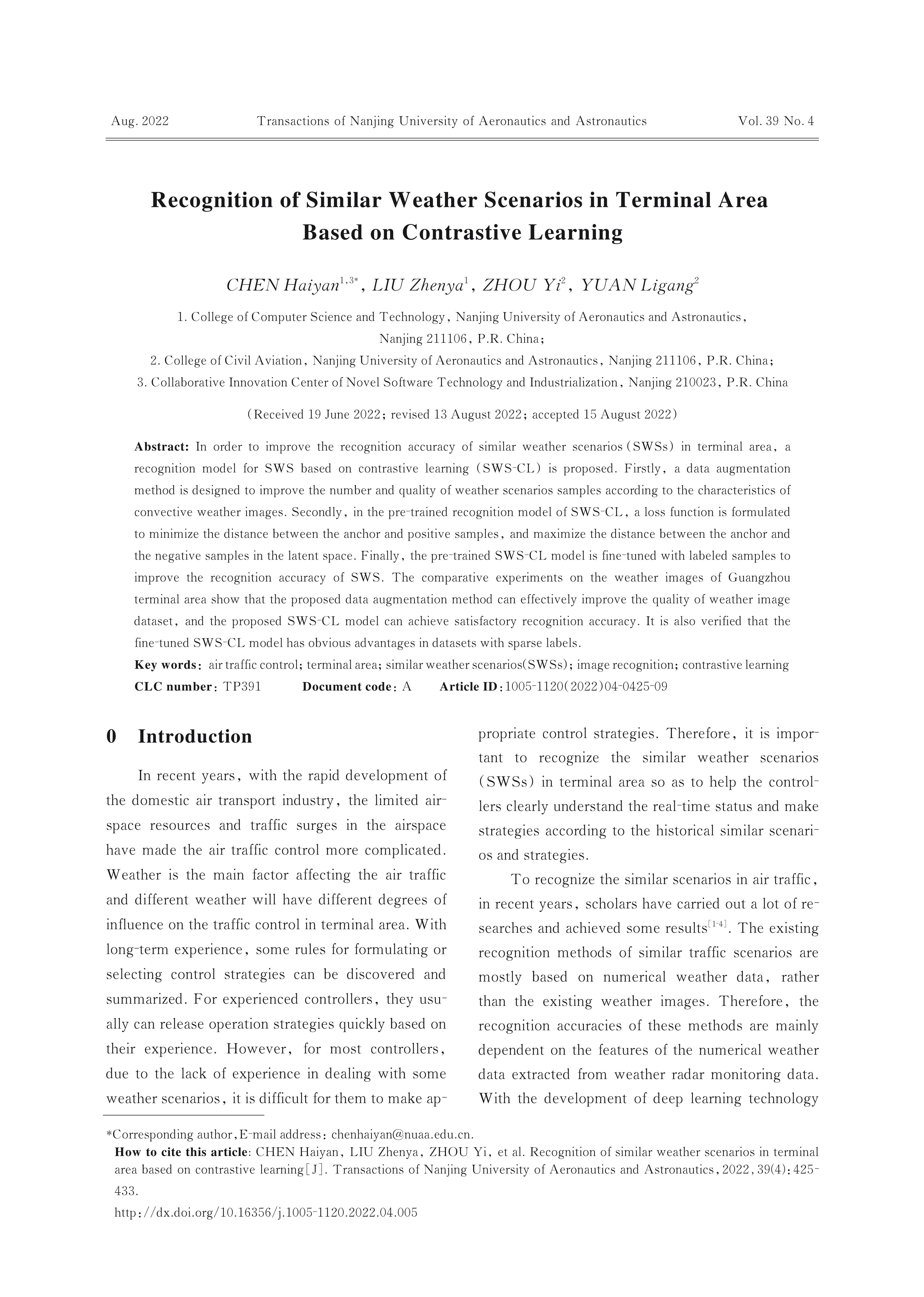 CHEN Haiyan, LIU Zhenya, ZHOU Yi, YUAN Ligang. Recognition of Similar Weather Scenarios in Terminal Area Based on Contrastive Learning[J]. Transactions of Nanjing University of Aeronautics & Astronautics,2022,(4):425-433