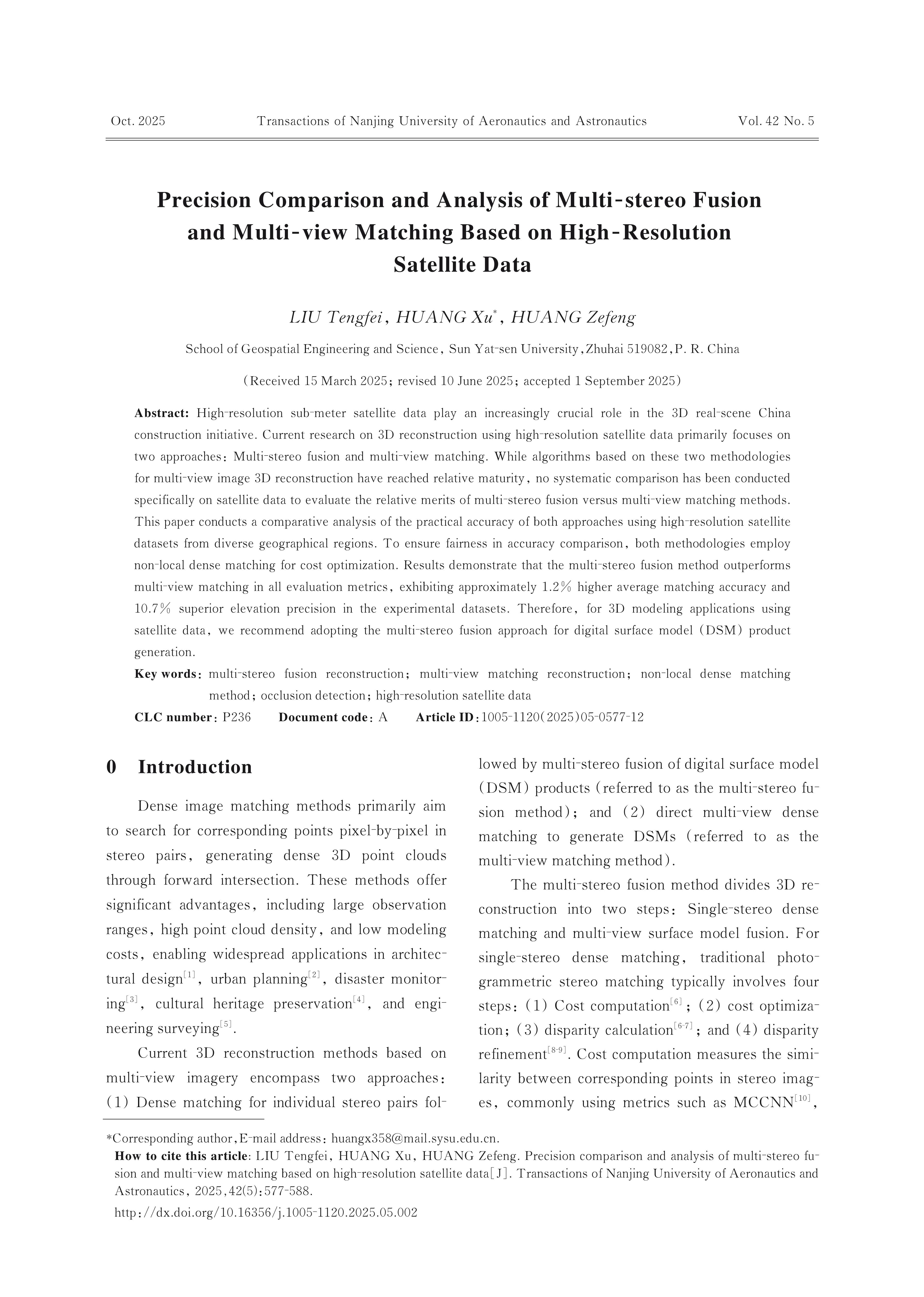 LIU Tengfei, HUANG Xu, HUANG Zefeng. Precision Comparison and Analysis of Multi-stereo Fusion and Multi-view Matching Based on High-Resolution Satellite Data[J]. Transactions of Nanjing University of Aeronautics & Astronautics,2025,(5):577-588