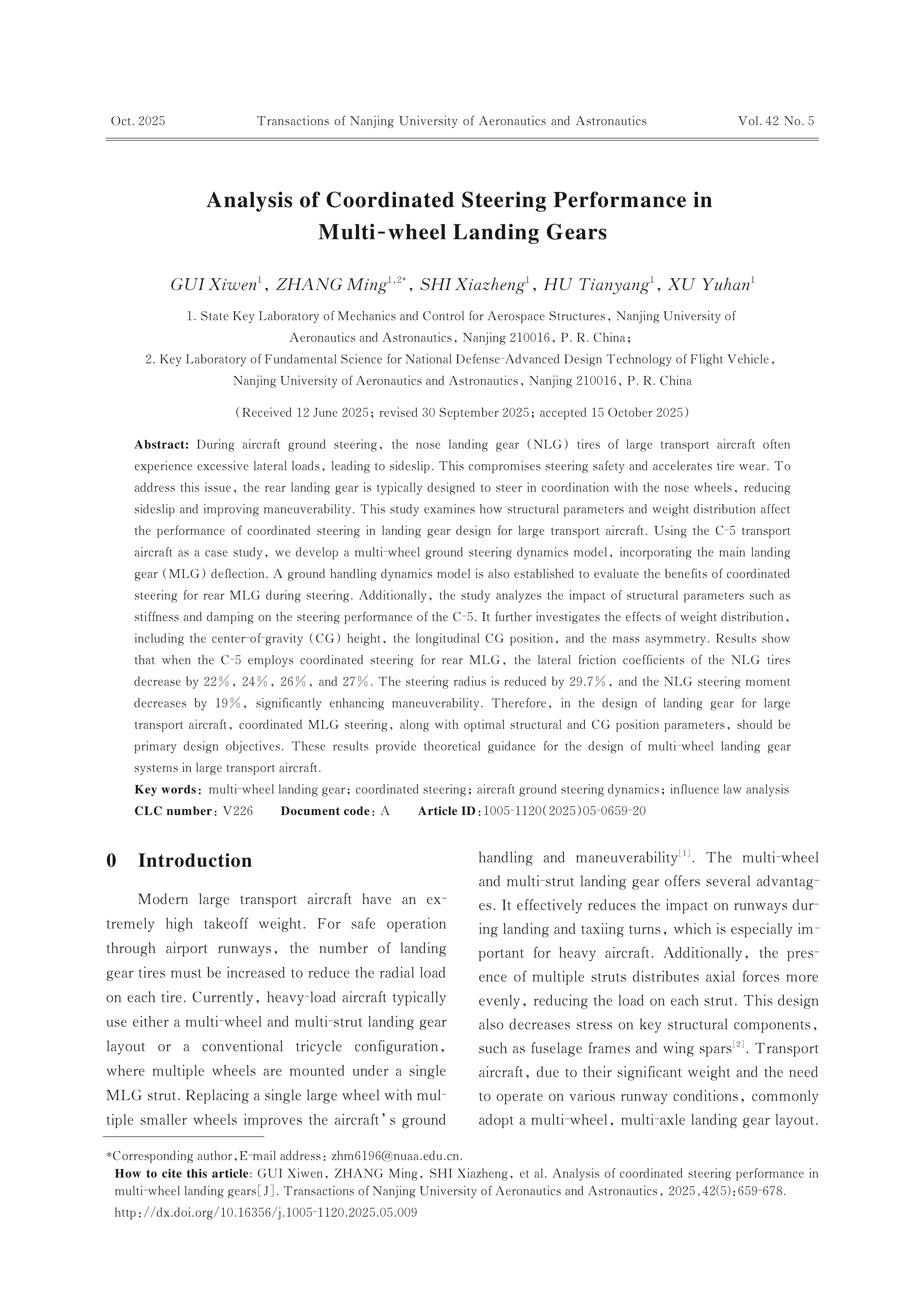 GUI Xiwen, ZHANG Ming, SHI Xiazheng, HU Tianyang, XU Yuhan. Analysis of Coordinated Steering Performance in Multi-wheel Landing Gears[J]. Transactions of Nanjing University of Aeronautics & Astronautics,2025,(5):659-678