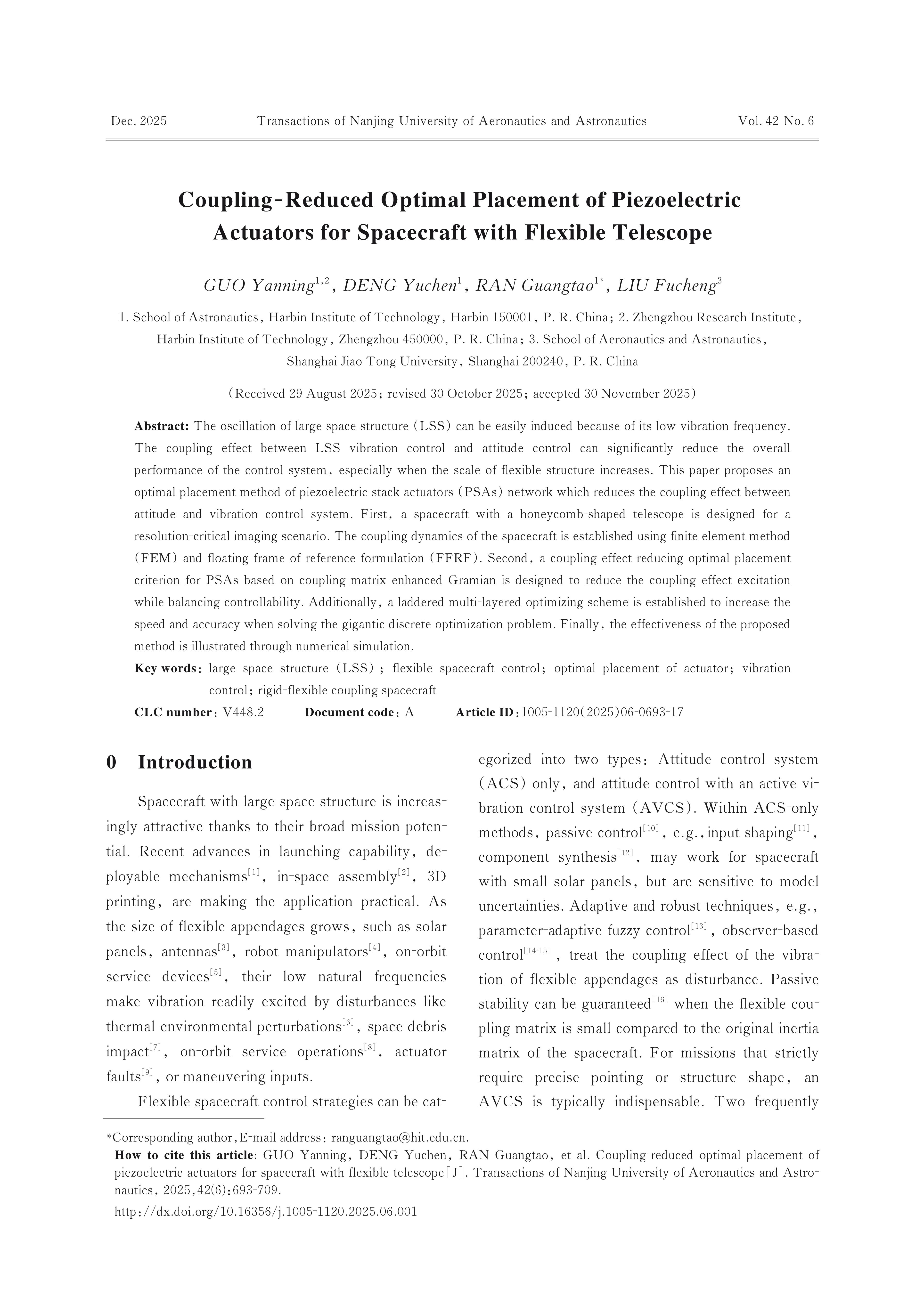 GUO Yanning, DENG Yuchen, RAN Guangtao, LIU Fucheng. Coupling-Reduced Optimal Placement of Piezoelectric Actuators for Spacecraft with Flexible Telescope[J]. Transactions of Nanjing University of Aeronautics & Astronautics,2025,(6):693-709