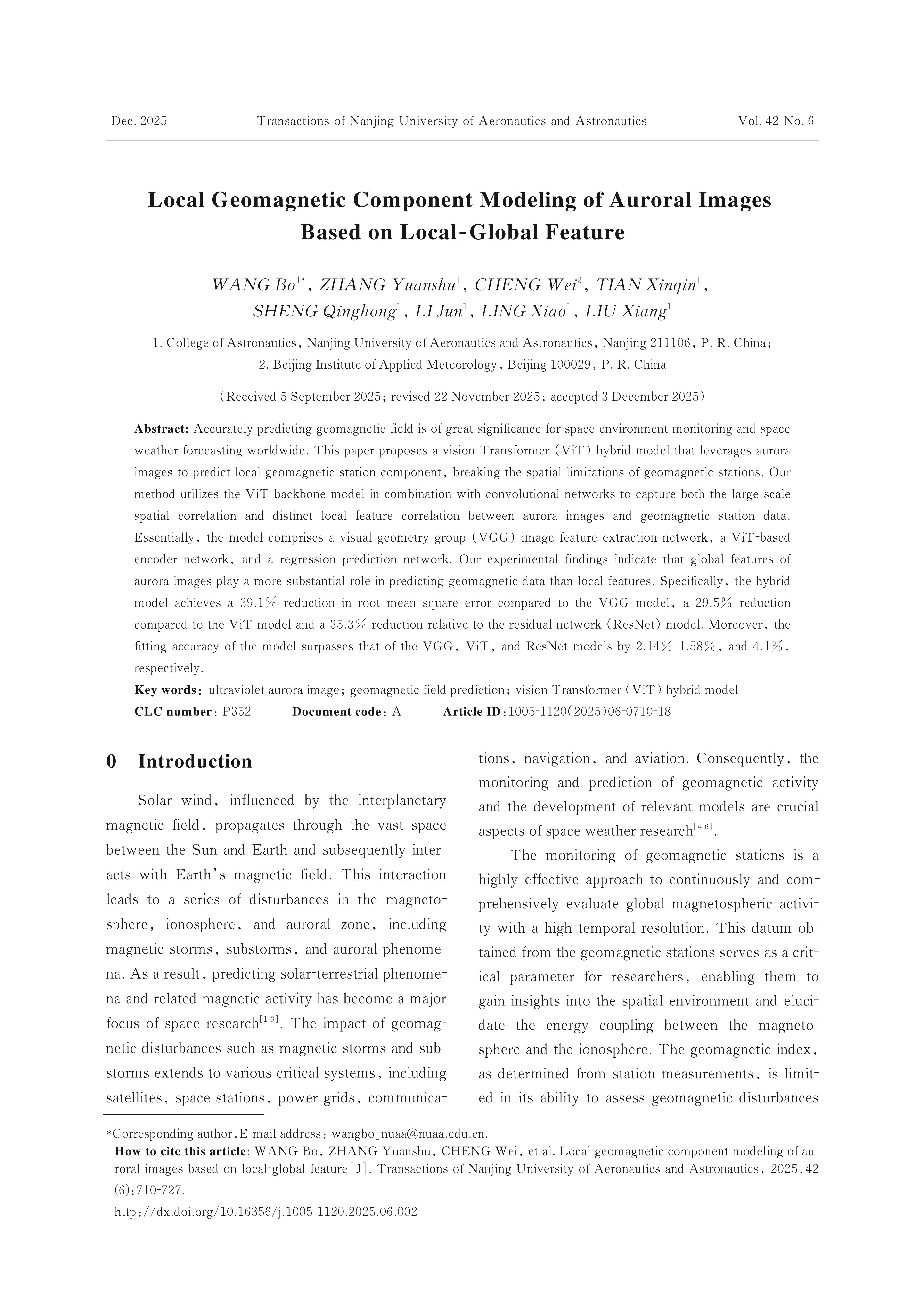 WANG Bo, ZHANG Yuanshu, CHENG Wei, TIAN Xinqin, SHENG Qinghong, LI Jun, LING Xiao, LIU Xiang. Local Geomagnetic Component Modeling of Auroral Images Based on Local-Global Feature[J]. Transactions of Nanjing University of Aeronautics & Astronautics,2025,(6):710-727