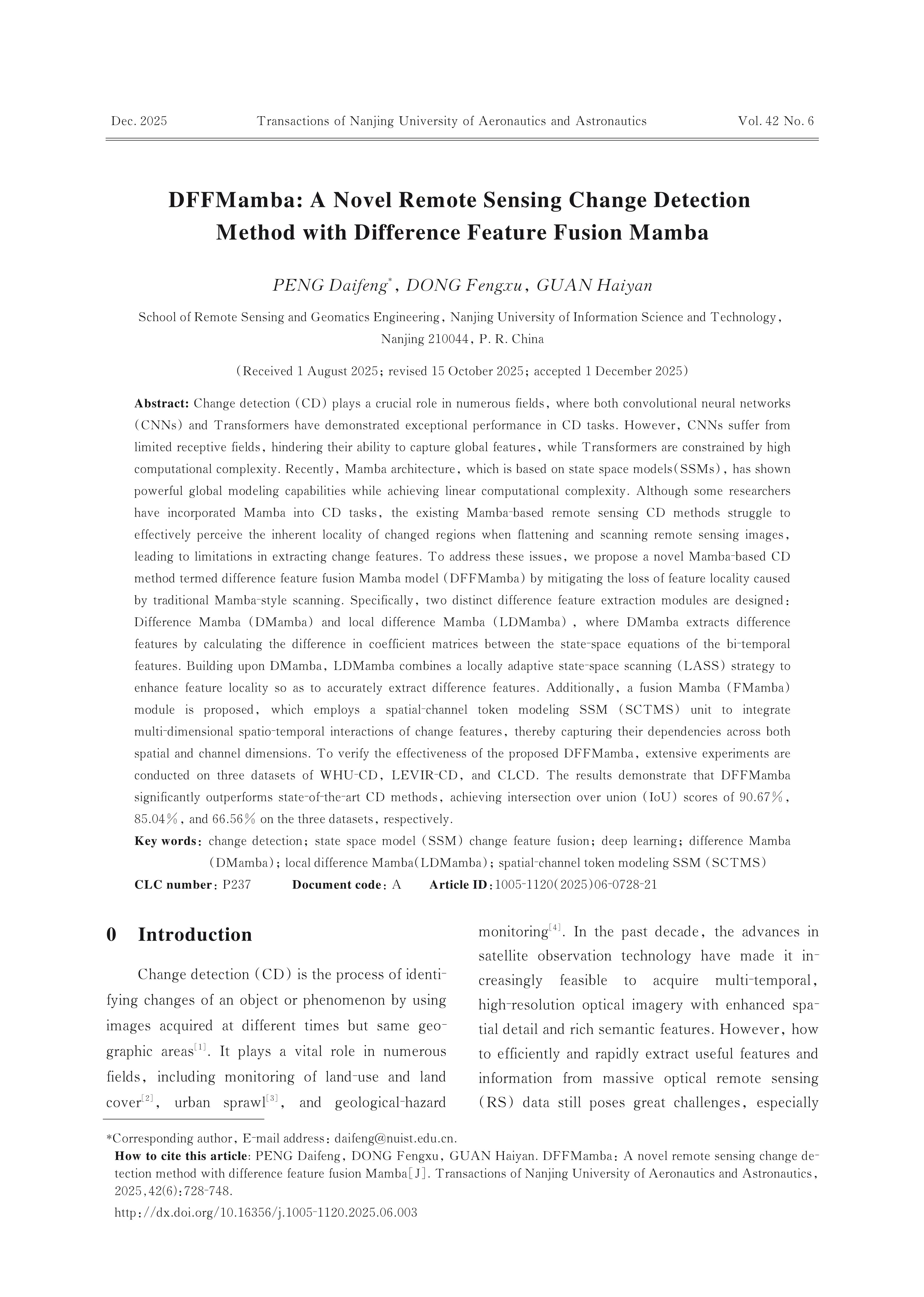 DFFMamba: A Novel Remote Sensing Change Detection Method with Difference Feature Fusion Mamba