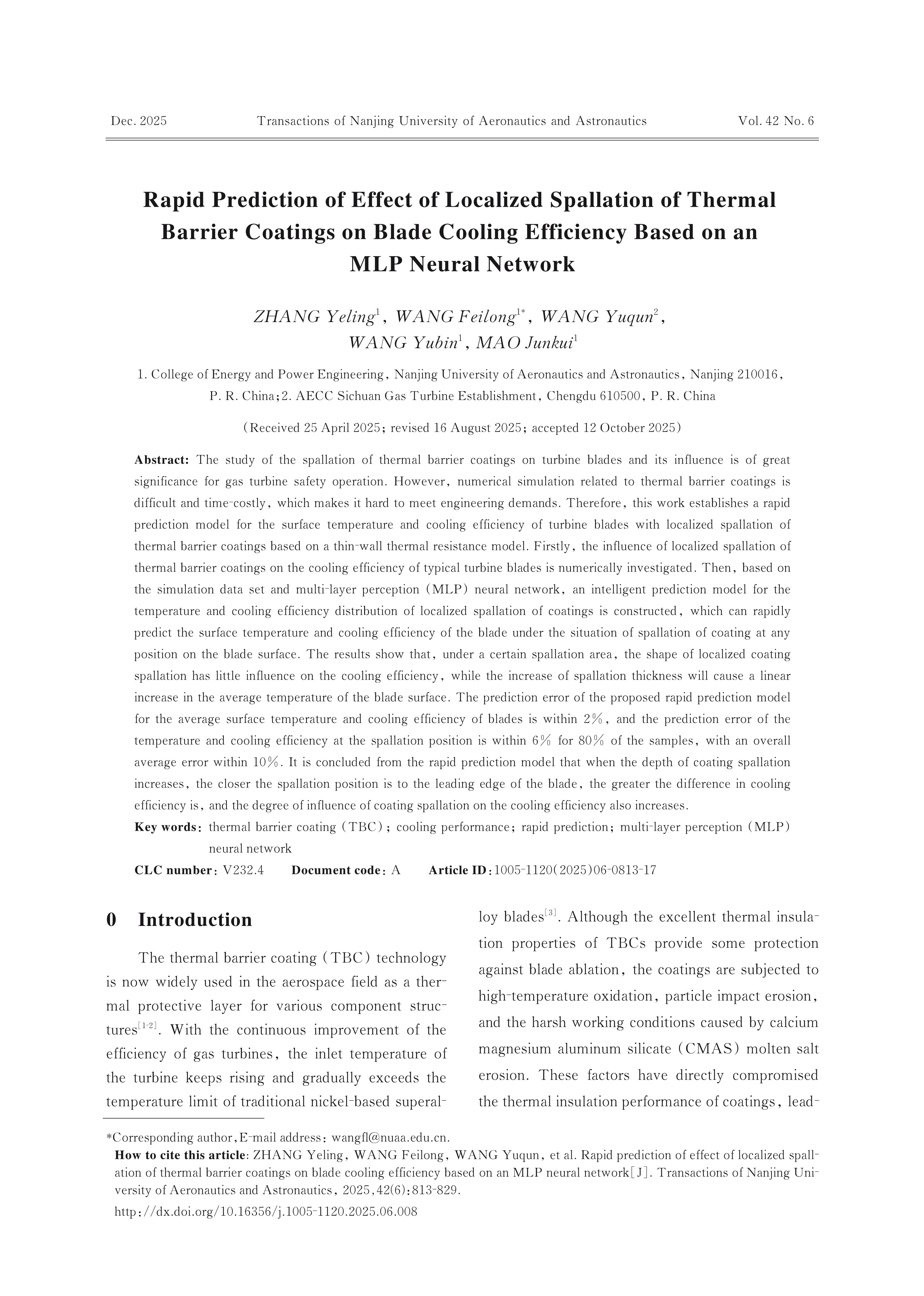ZHANG Yeling, WANG Feilong, WANG Yuqun, WANG Yubin, MAO Junkui. Rapid Prediction of Effect of Localized Spallation of Thermal Barrier Coatings on Blade Cooling Efficiency Based on an MLP Neural Network[J]. Transactions of Nanjing University of Aeronautics & Astronautics,2025,(6):801-817