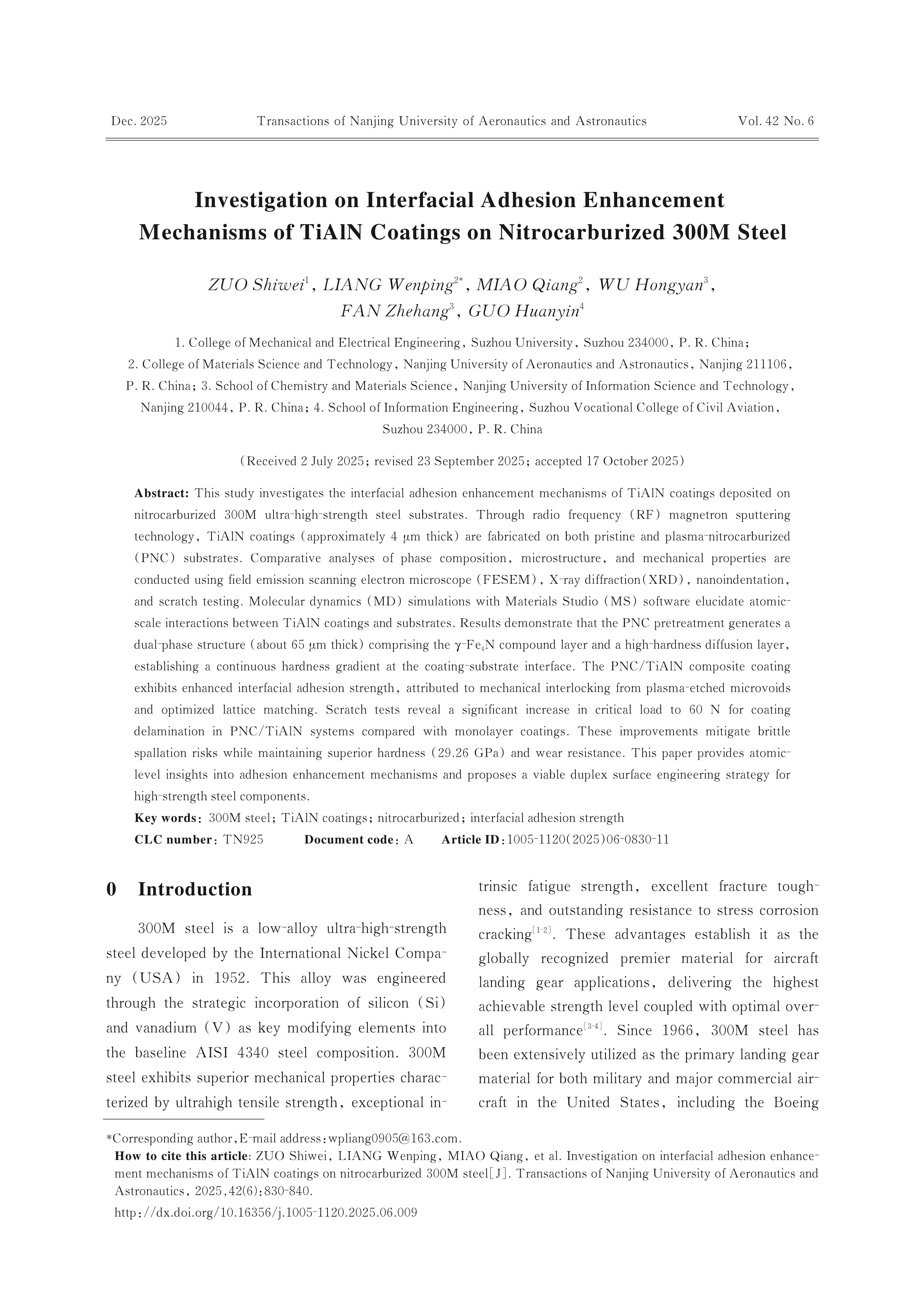 ZUO Shiwei, LIANG Wenping, MIAO Qiang, WU Hongyan, FAN Zhehang, GUO Huanyin. Investigation on Interfacial Adhesion Enhancement Mechanisms of TiAlN Coatings on Nitrocarburized 300M Steel[J]. Transactions of Nanjing University of Aeronautics & Astronautics,2025,(6):818-828