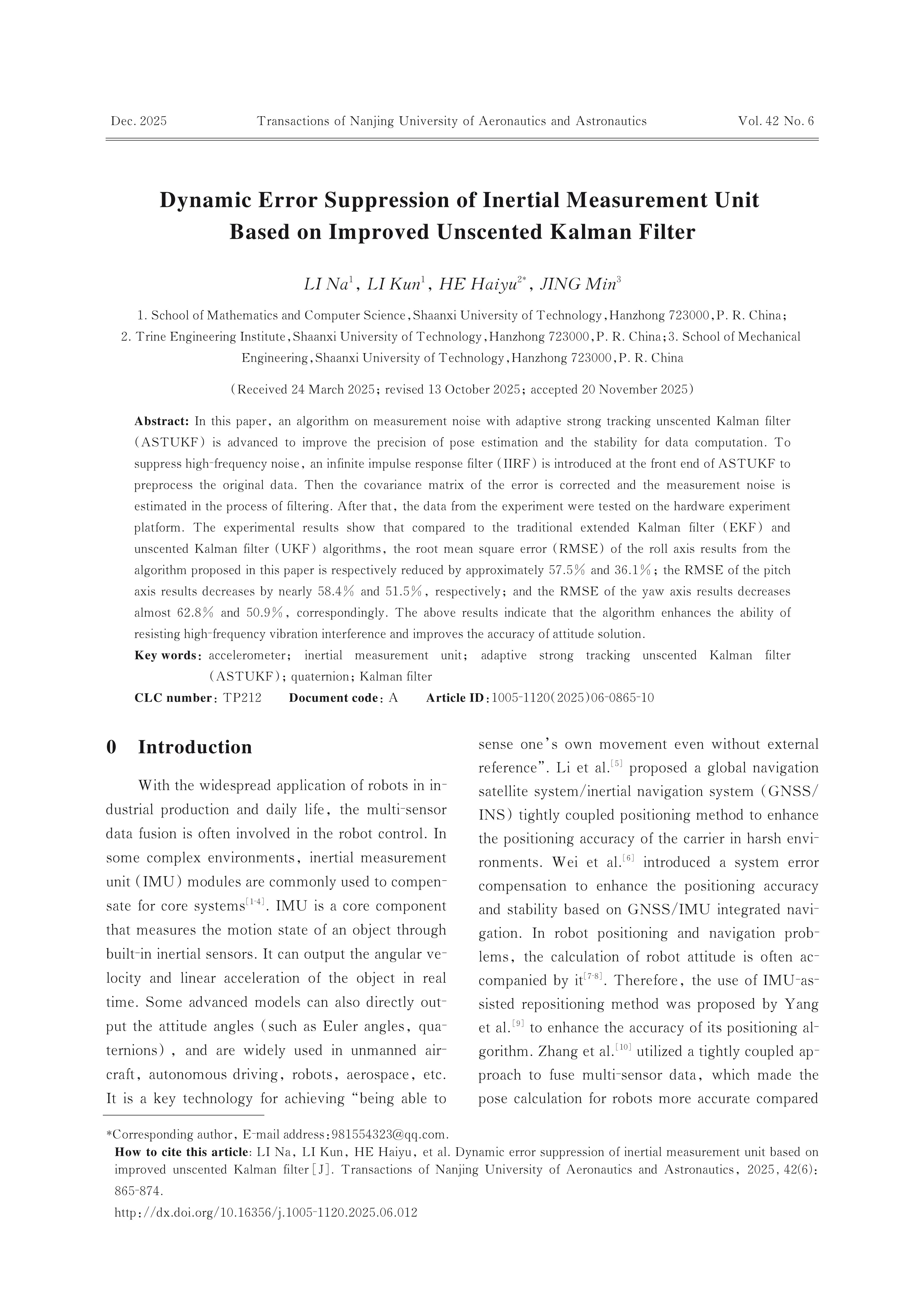 LI Na, LI Kun, HE Haiyu, JING Min. Dynamic Error Suppression of Inertial Measurement Unit Based on Improved Unscented Kalman Filter[J]. Transactions of Nanjing University of Aeronautics & Astronautics,2025,(6):865-874