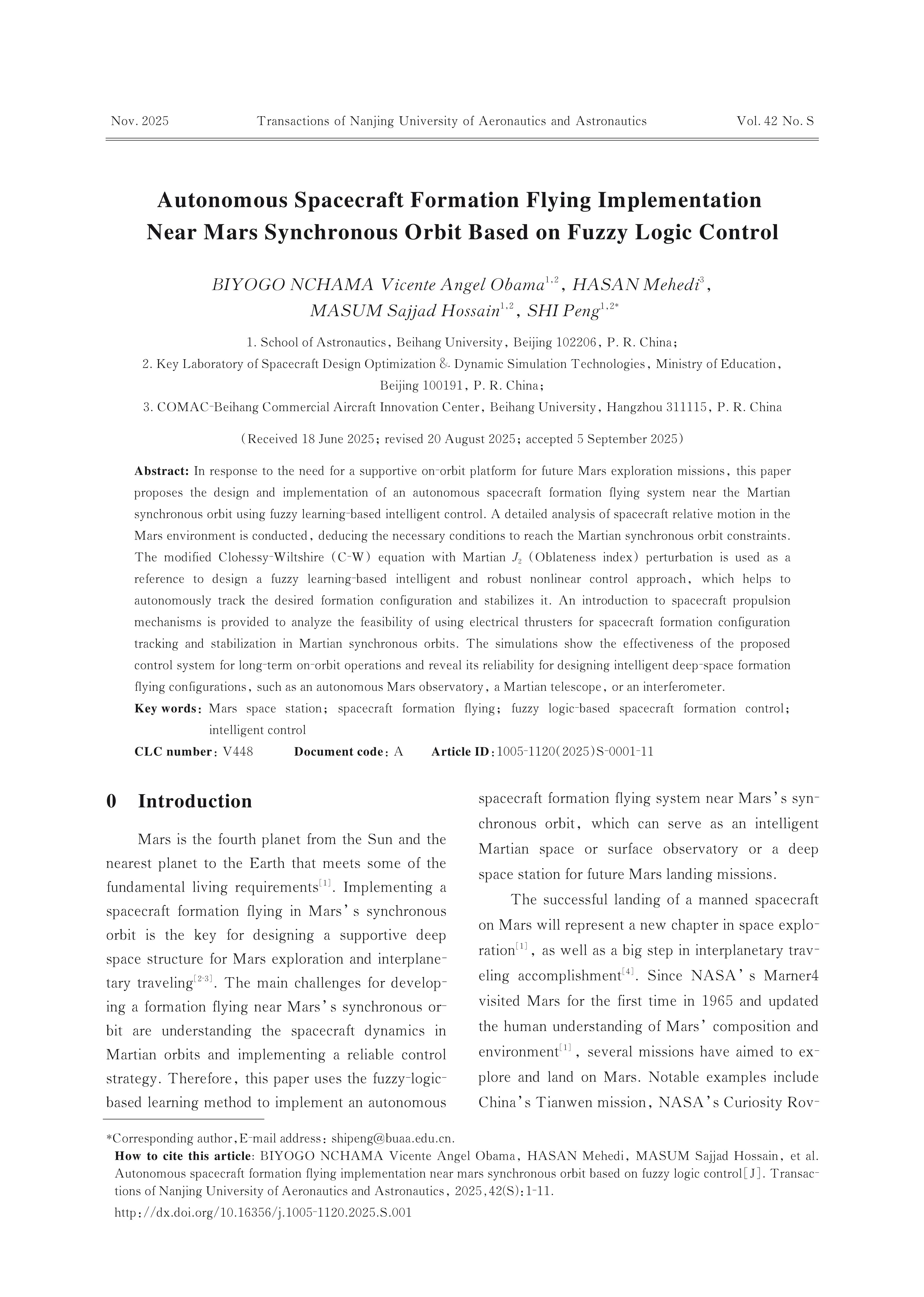 BIYOGO NCHAMA Vicente Angel Obama, HASAN Mehedi, MASUM Sajjad Hossain, SHI Peng. Autonomous Spacecraft Formation Flying Implementation Near Mars Synchronous Orbit Based on Fuzzy Logic Control[J]. Transactions of Nanjing University of Aeronautics & Astronautics,2025,(S):1-11