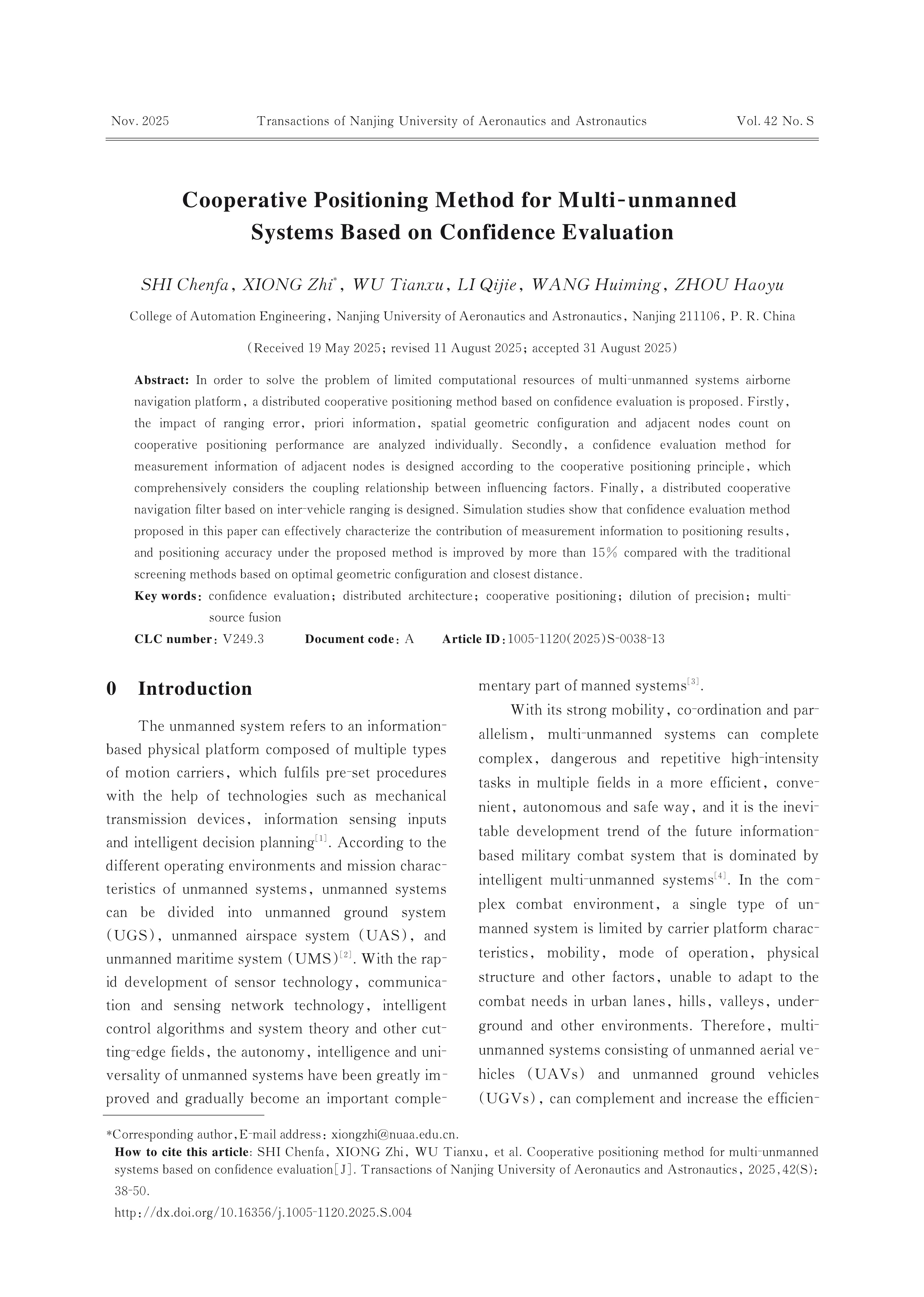 SHI Chenfa, XIONG Zhi, WU Tianxu, LI Qijie, WANG Huiming, ZHOU Haoyu. Cooperative Positioning Method for Multi-unmanned Systems Based on Confidence Evaluation[J]. Transactions of Nanjing University of Aeronautics & Astronautics,2025,(S):38-50
