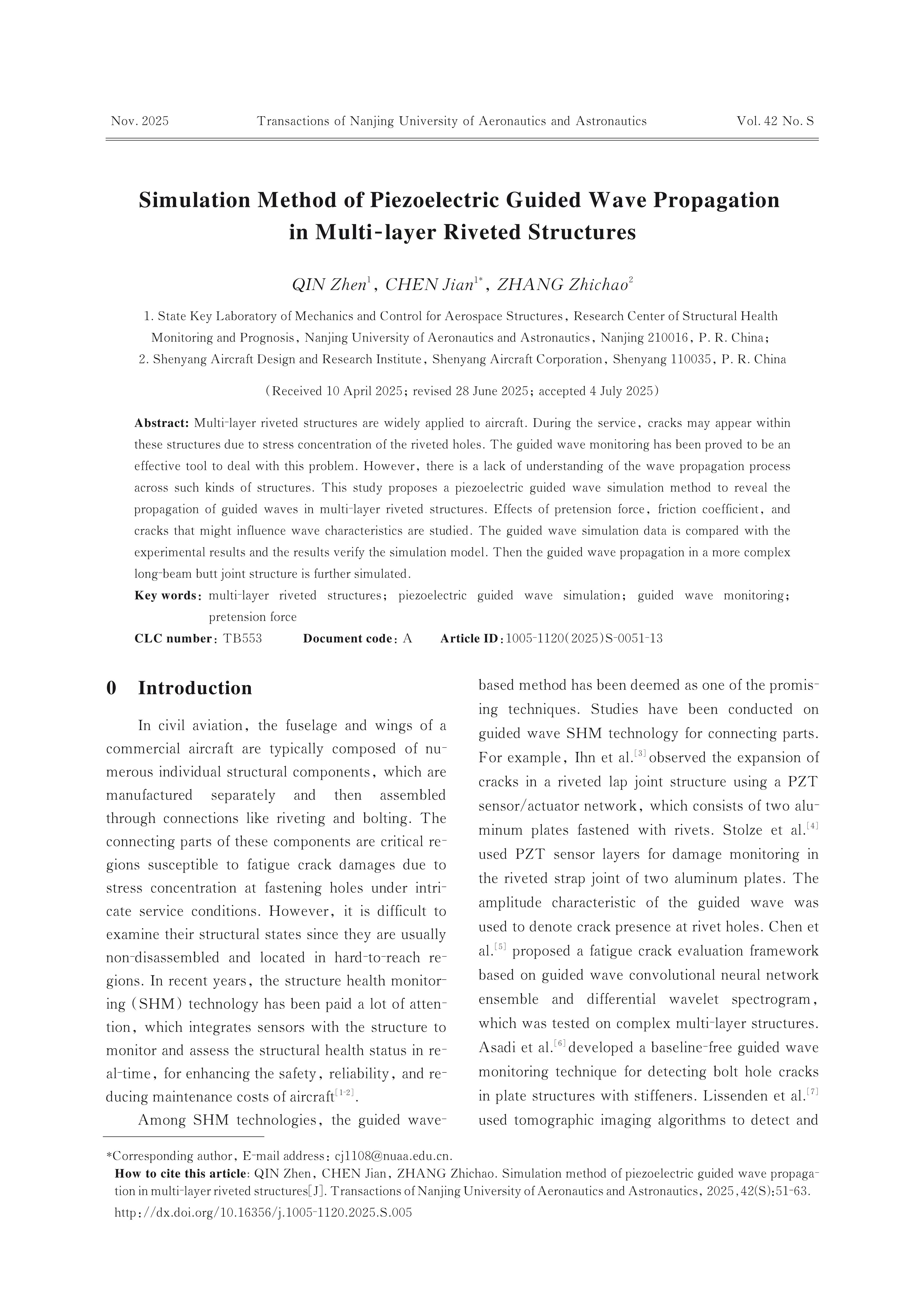 QIN Zhen, CHEN Jian, ZHANG Zhichao. Simulation Method of Piezoelectric Guided Wave Propagation in Multi-layer Riveted Structures[J]. Transactions of Nanjing University of Aeronautics & Astronautics,2025,(S):51-63