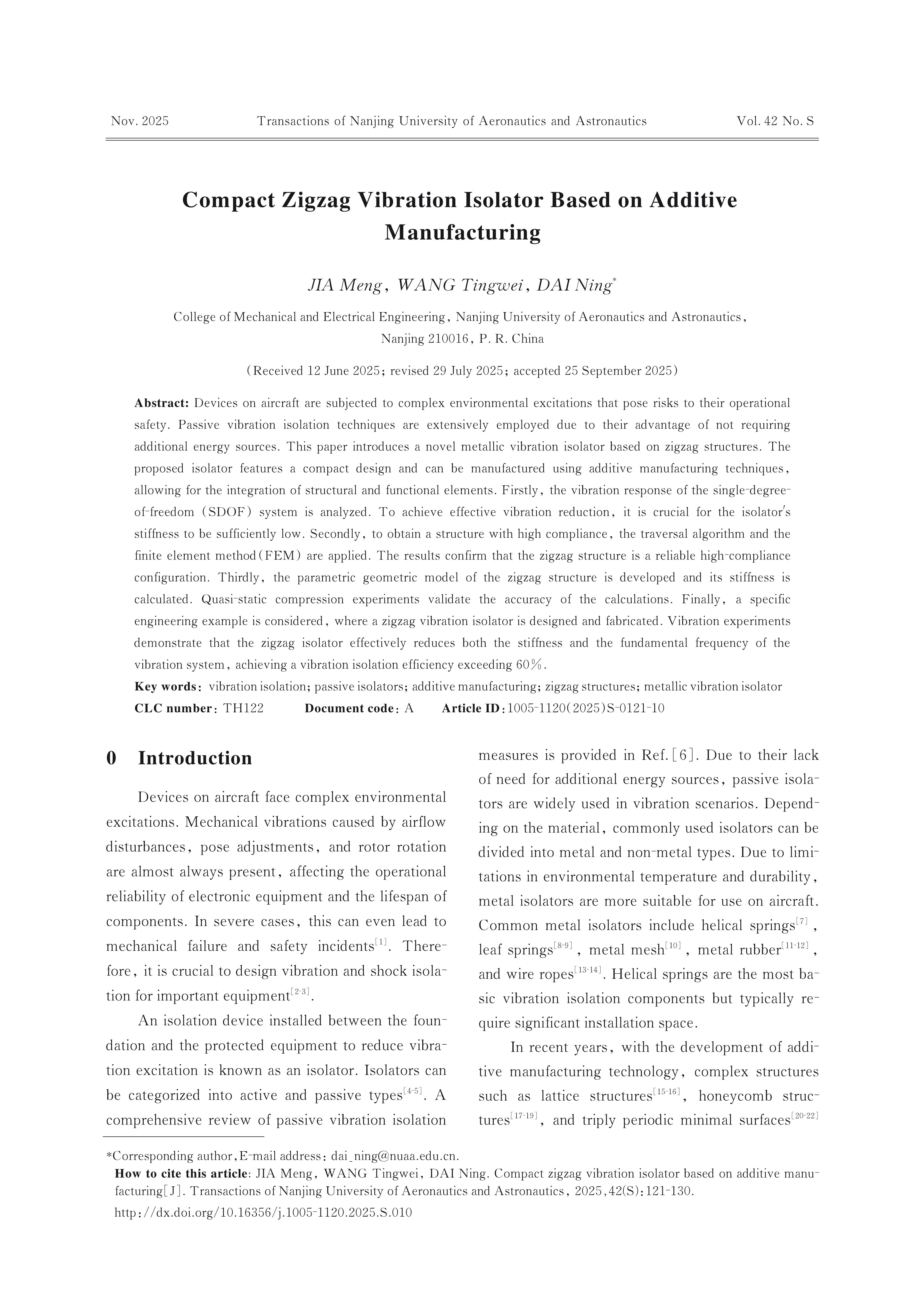 JIA Meng, WANG Tingwei, DAI Ning. Compact Zigzag Vibration Isolator Based on Additive Manufacturing[J]. Transactions of Nanjing University of Aeronautics & Astronautics,2025,(S):121-130