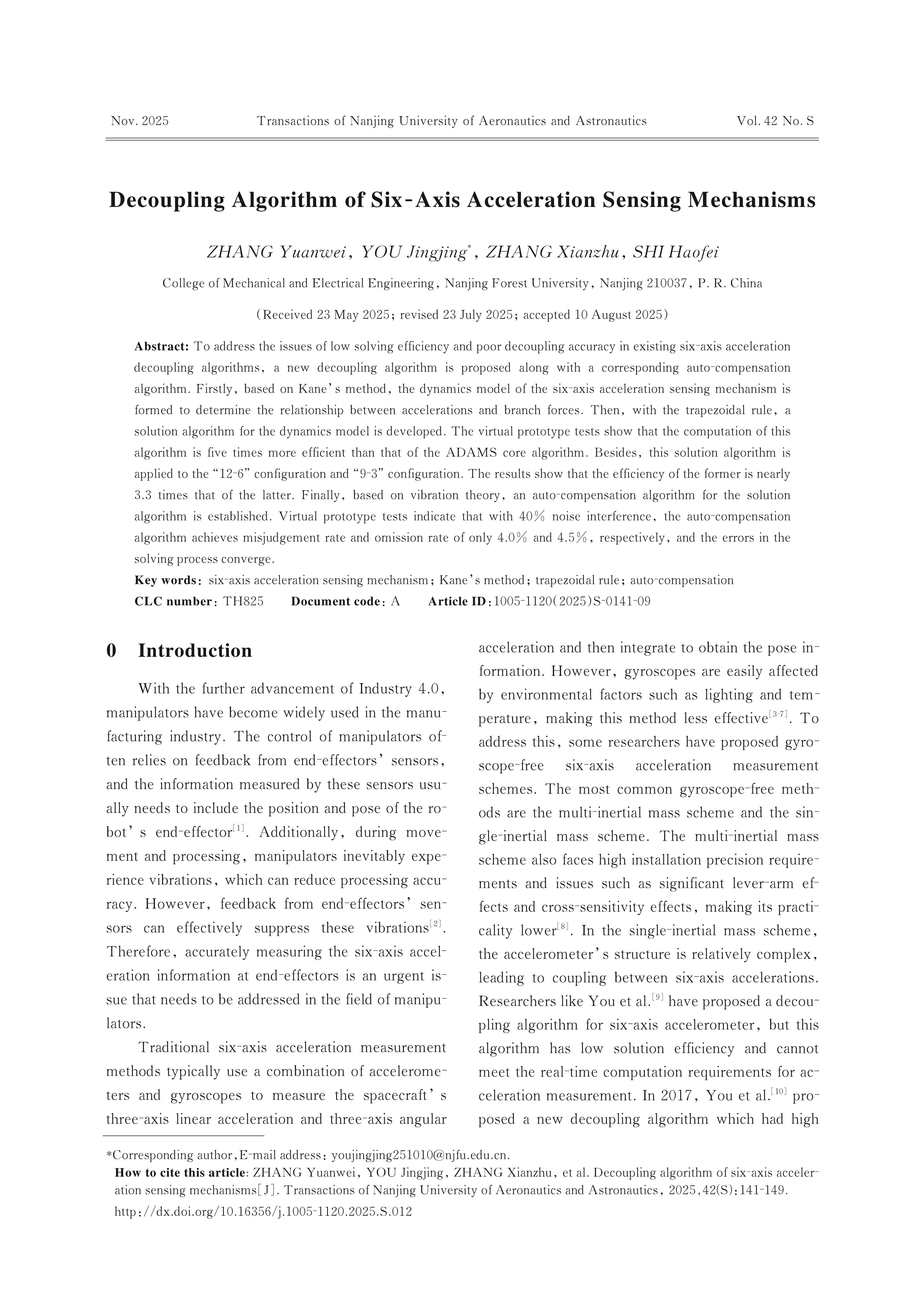 ZHANG Yuanwei, YOU Jingjing, ZHANG Xianzhu, SHI Haofei. Decoupling Algorithm of Six-Axis Acceleration Sensing Mechanisms[J]. Transactions of Nanjing University of Aeronautics & Astronautics,2025,(S):141-149