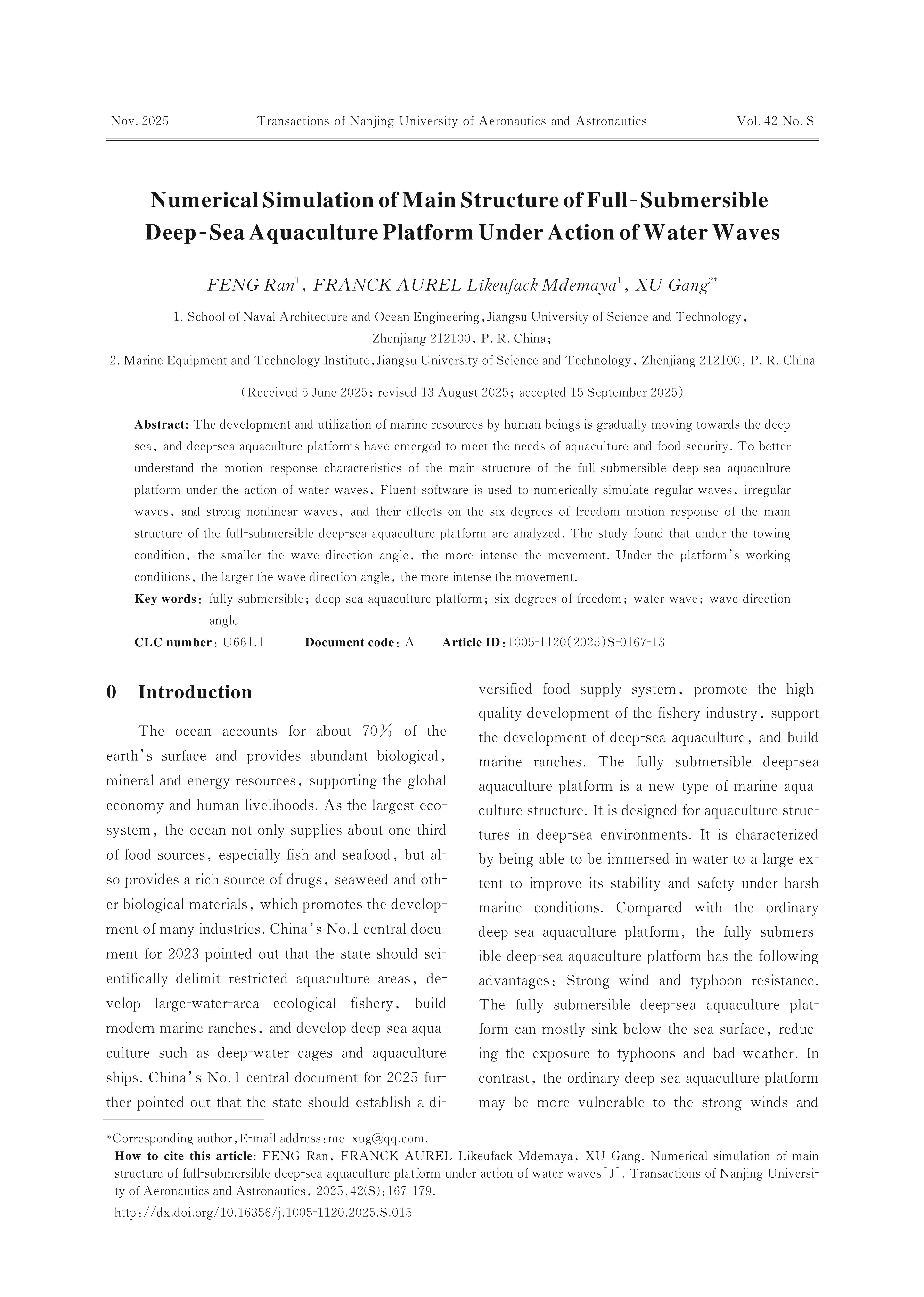 FENG Ran, FRANCK AUREL Likeufack Mdemaya, XU Gang. Numerical Simulation of Main Structure of Full-Submersible Deep-Sea Aquaculture Platform Under Action of Water Waves[J]. Transactions of Nanjing University of Aeronautics & Astronautics,2025,(S):167-179