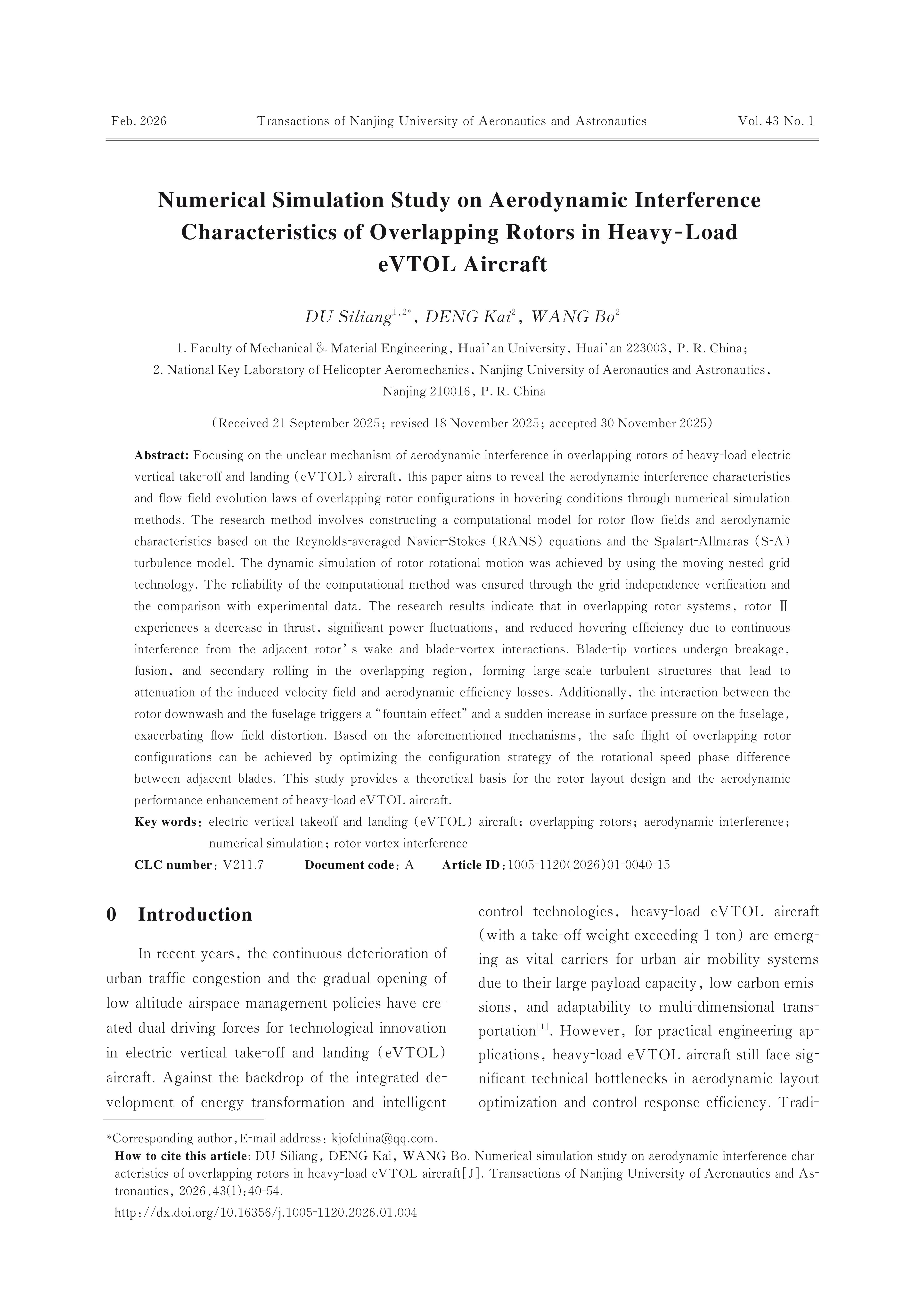 DU Siliang, DENG Kai, WANG Bo. Numerical Simulation Study on Aerodynamic Interference Characteristics of Overlapping Rotors in Heavy-Load eVTOL Aircraft[J]. Transactions of Nanjing University of Aeronautics & Astronautics,2026,(1):40-54